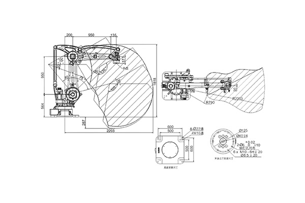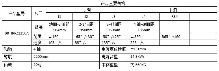 BRTIRPZ2250A是针对某些单调、频繁和重复的长时间作业,或是危险、恶劣环境下的作业等而开发的一款四轴码垛机器人,其拥有2200mm臂展,负载可达50KG。多自由度的灵活性对上下料、搬运、拆垛、码垛等场景能够应对自如。